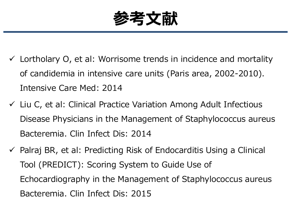 #19. 参考文献 Lortholary O, et al: Worrisome trends in incidence and mortality of candidemia in intensive care units (Paris area, 2002-2010). Intensive Care Med: 2014 Liu C, et al: Clinical Practice Variation Among Adult Infectious Disease Physicians in the Management of Staphylococcus aureus Bacteremia. Clin Infect Dis: 2014 Palraj BR, et al: Predicting Risk of Endocarditis Using a Clinical Tool (PREDICT): Scoring System to Guide Use of Echocardiography in the Management of Staphylococcus aureus Bacteremia. Clin Infect Dis: 2015