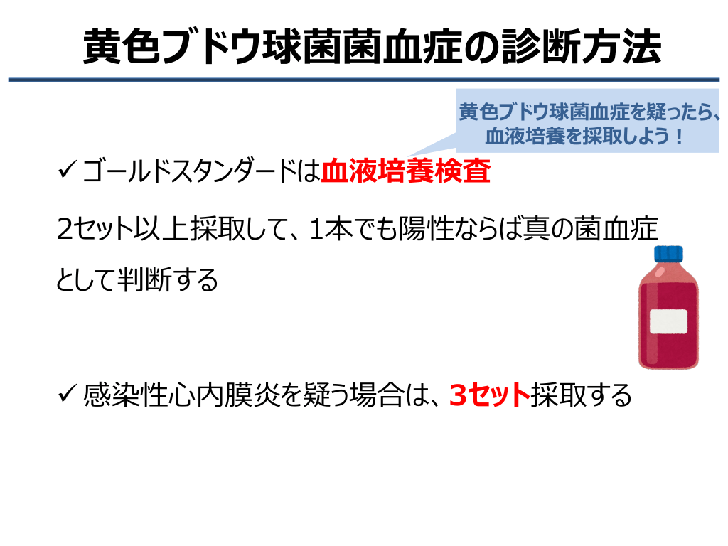 #5. 黄色ブドウ球菌菌血症の診断方法 黄色ブドウ球菌血症を疑ったら、 血液培養を採取しよう! ゴールドスタンダードは血液培養検査 2セット以上採取して、1本でも陽性ならば真の菌血症 として判断する 感染性心内膜炎を疑う場合は、3セット採取する