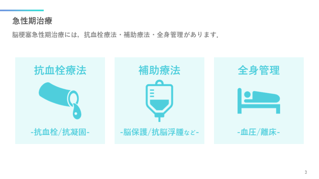 #4. 急性期治療 脳梗塞急性期治療には,抗血栓療法・補助療法・全身管理があります. 3 抗血栓療法