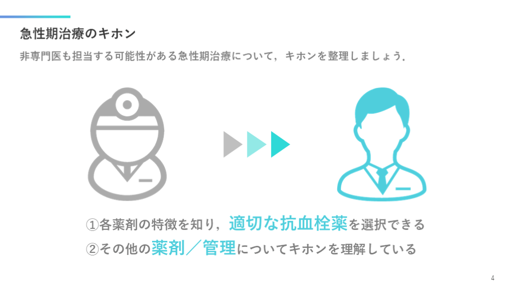 #5. 急性期治療のキホン 非専門医も担当する可能性がある急性期治療について,キホンを整理しましょう. 4 ①各薬剤の特徴を知り,適切な抗血栓薬を選択できる