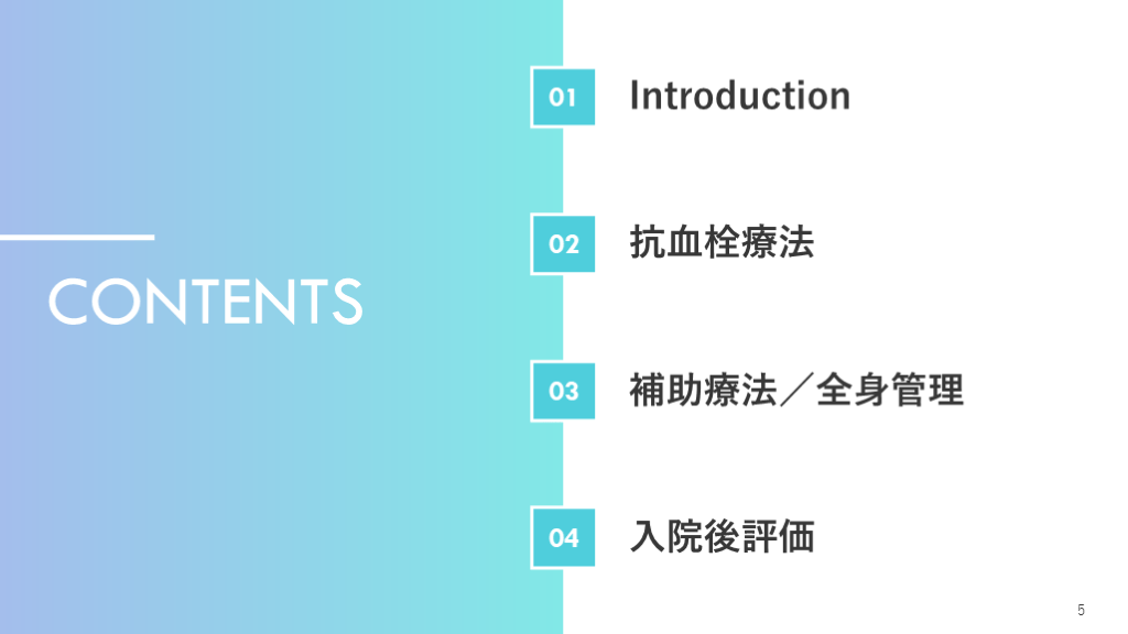 #6. CONTENTS 5 Introduction 抗血栓療法 補助療法/全身管理 入院後評価 01 02 03 04