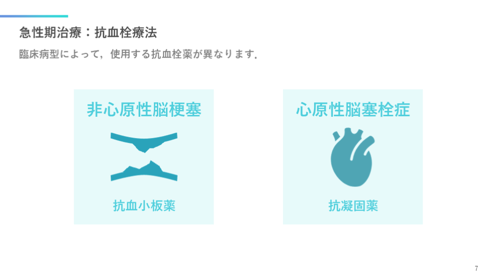 #8. 急性期治療:抗血栓療法 臨床病型によって,使用する抗血栓薬が異なります. 7 非心原性脳梗塞