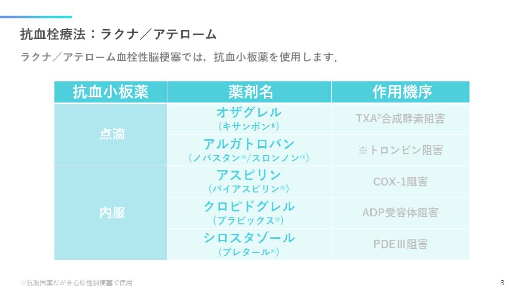 #9. 抗血栓療法:ラクナ/アテローム ラクナ/アテローム血栓性脳梗塞では,抗血小板薬を使用します. ※抗凝固薬だが非心原性脳梗塞で使用 8