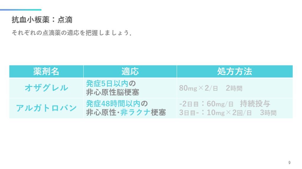 #10. 抗血小板薬:点滴 それぞれの点滴薬の適応を把握しましょう. 9