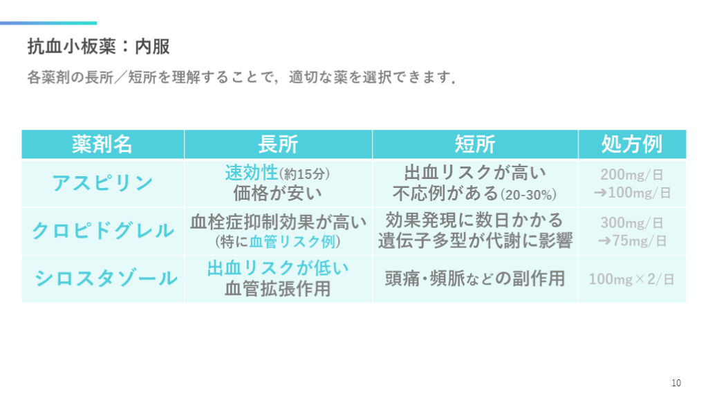 #11. 抗血小板薬:内服 各薬剤の長所/短所を理解することで,適切な薬を選択できます. 10