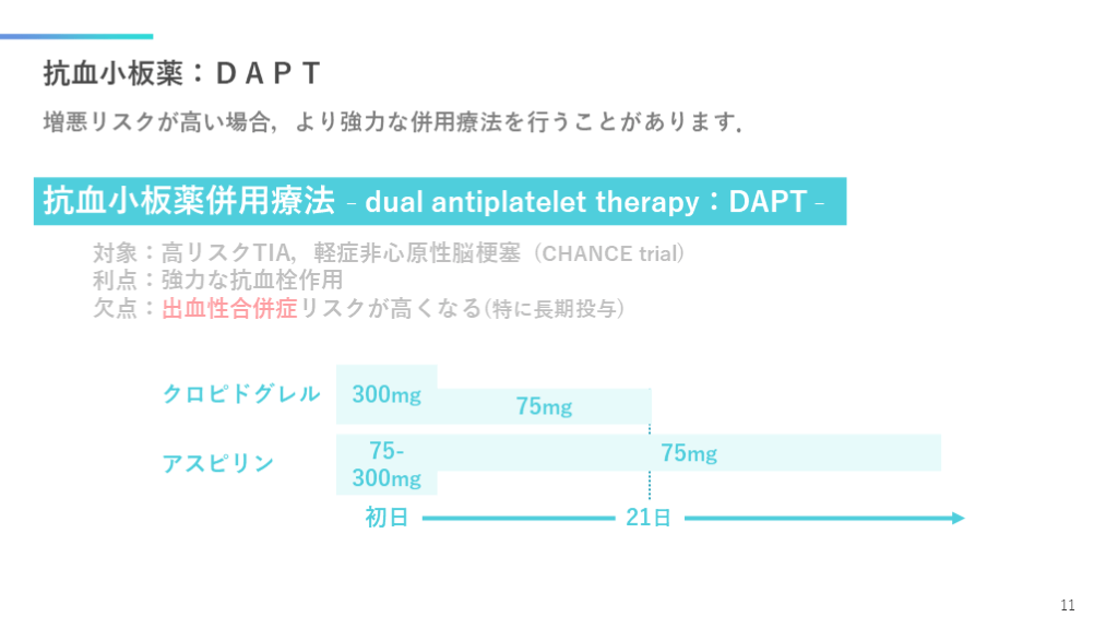 #12. 抗血小板薬:DAPT 増悪リスクが高い場合,より強力な併用療法を行うことがあります. 11 対象:高リスクTIA,軽症非心原性脳梗塞 (CHANCE trial)