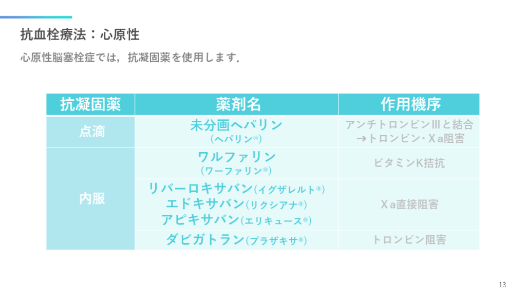 #14. 抗血栓療法:心原性 心原性脳塞栓症では,抗凝固薬を使用します. 13