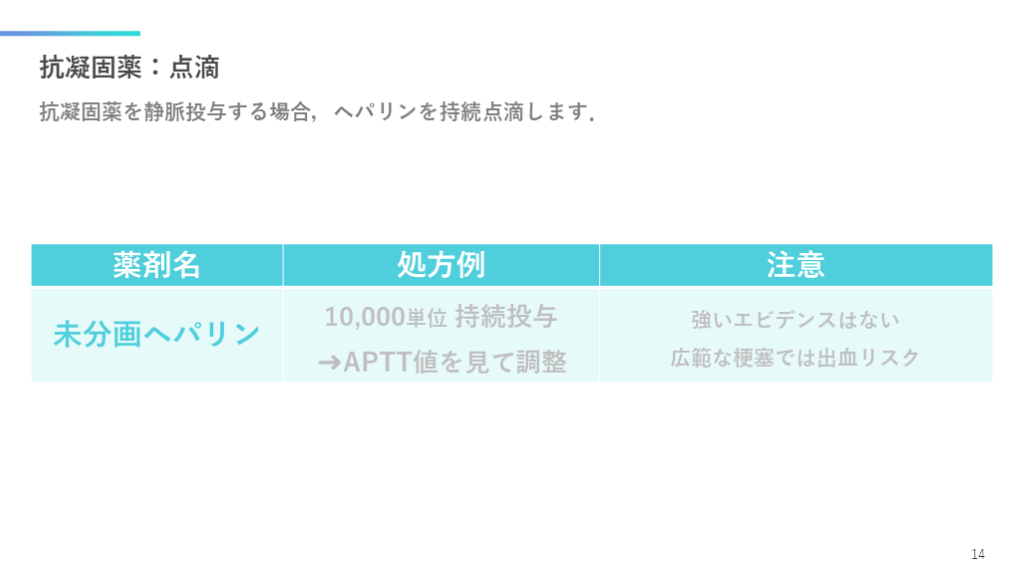 #15. 抗凝固薬:点滴 抗凝固薬を静脈投与する場合,ヘパリンを持続点滴します. 14