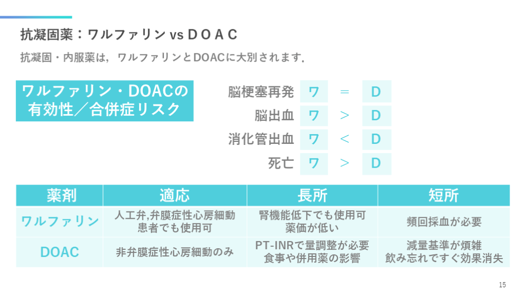 #16. 抗凝固薬:ワルファリン vs DOAC 抗凝固・内服薬は,ワルファリンとDOACに大別されます. 15 ワルファリン・DOACの