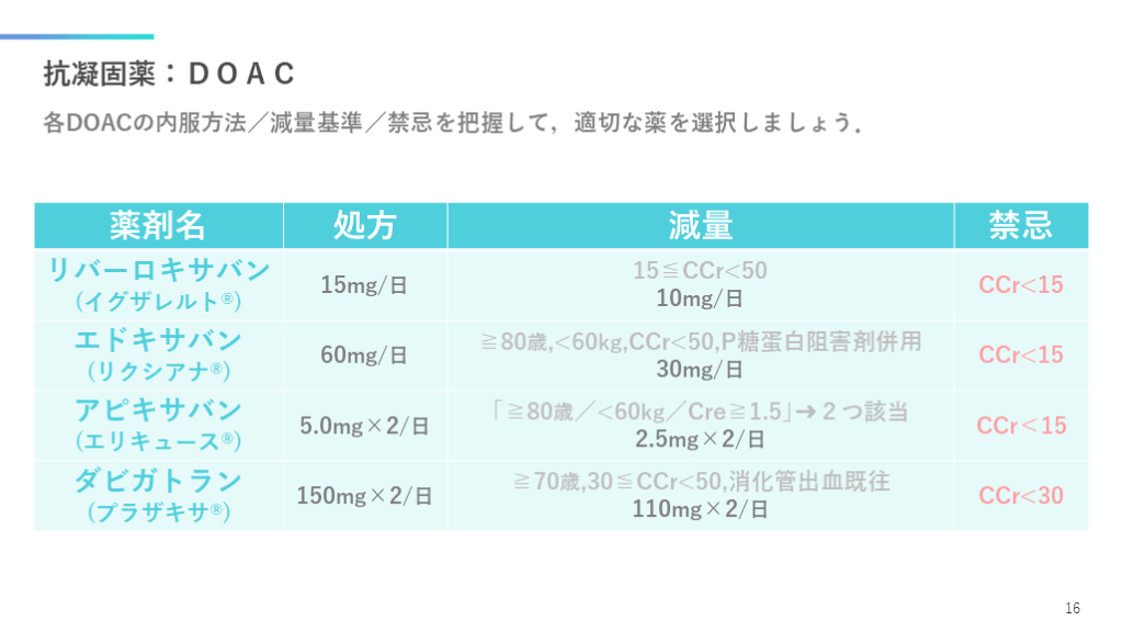 #17. 抗凝固薬:DOAC 各DOACの内服方法/減量基準/禁忌を把握して,適切な薬を選択しましょう. 16