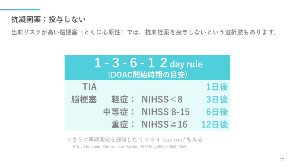 #18. 抗凝固薬:投与しない 出血リスクが高い脳梗塞(とくに心原性)では,抗血栓薬を投与しないという選択肢もあります. 17 ※さらに早期開始を提唱した“1-2-3-4 day rule”もある