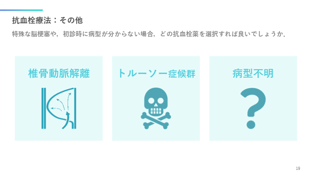 #20. 抗血栓療法:その他 特殊な脳梗塞や,初診時に病型が分からない場合,どの抗血栓薬を選択すれば良いでしょうか. 19 椎骨動脈解離