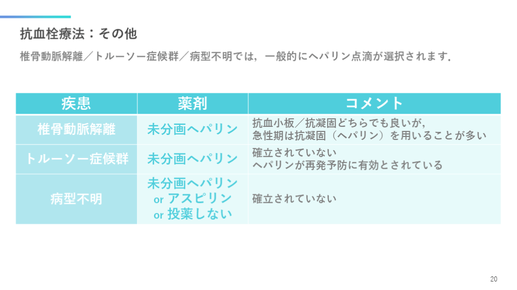 #21. 抗血栓療法:その他 椎骨動脈解離/トルーソー症候群/病型不明では,一般的にヘパリン点滴が選択されます. 20