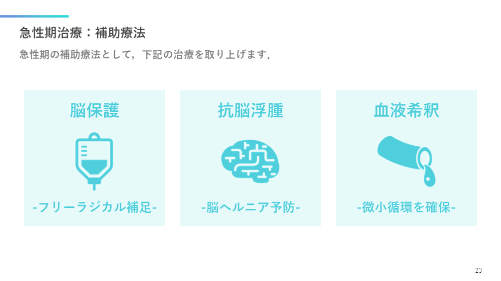 #24. 急性期治療:補助療法 急性期の補助療法として,下記の治療を取り上げます. 23 脳保護