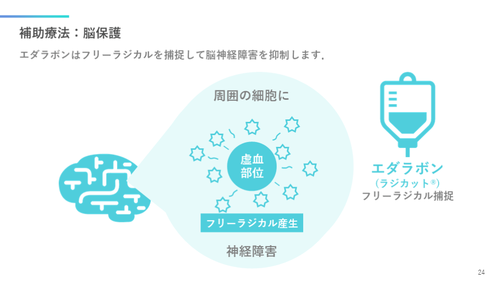 神経障害 補助療法:脳保護 エダラボンはフリーラジカルを捕捉して脳神経障害を抑制します. 24 虚血部位 フリーラジカル産生 エダラボン