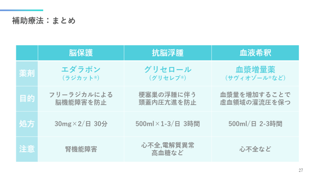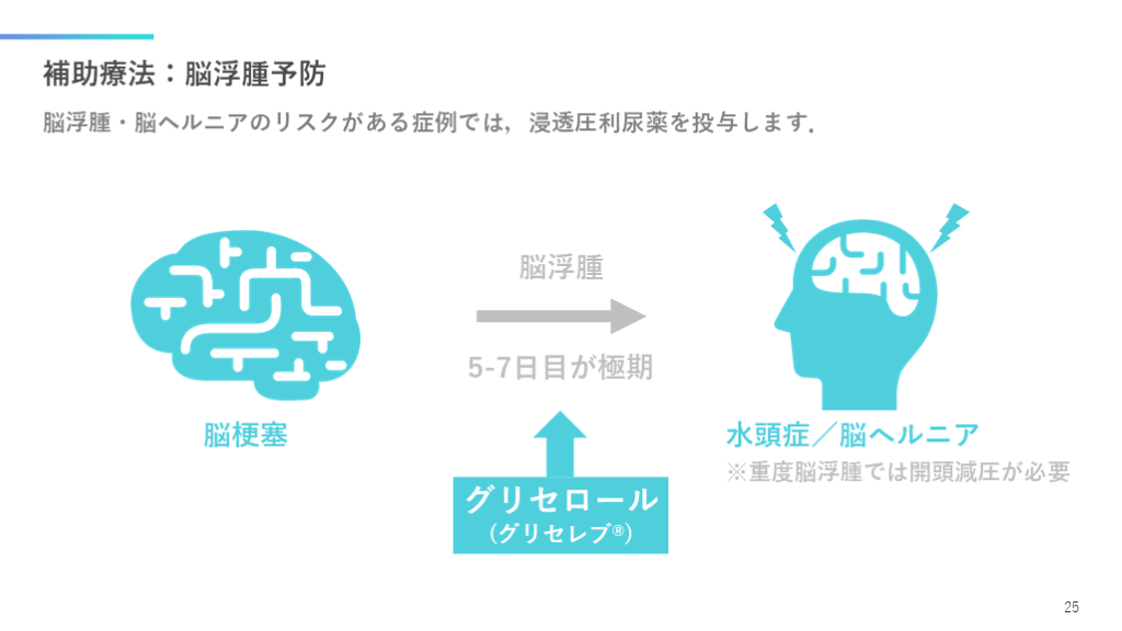 #26. 補助療法:脳浮腫予防 脳浮腫・脳ヘルニアのリスクがある症例では,浸透圧利尿薬を投与します. 25 水頭症/脳ヘルニア 脳梗塞 5-7日目が極期 脳浮腫 ※重度脳浮腫では開頭減圧が必要 グリセロール