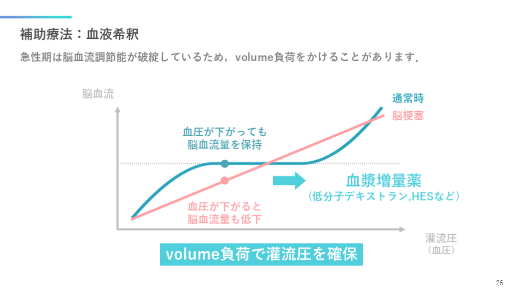 #27. 補助療法:血液希釈 急性期は脳血流調節能が破綻しているため,volume負荷をかけることがあります. 26 灌流圧