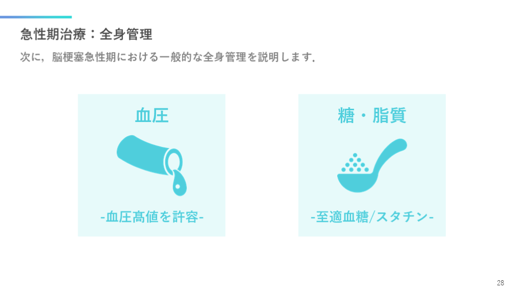 #29. 急性期治療:全身管理 次に,脳梗塞急性期における一般的な全身管理を説明します. 28 血圧