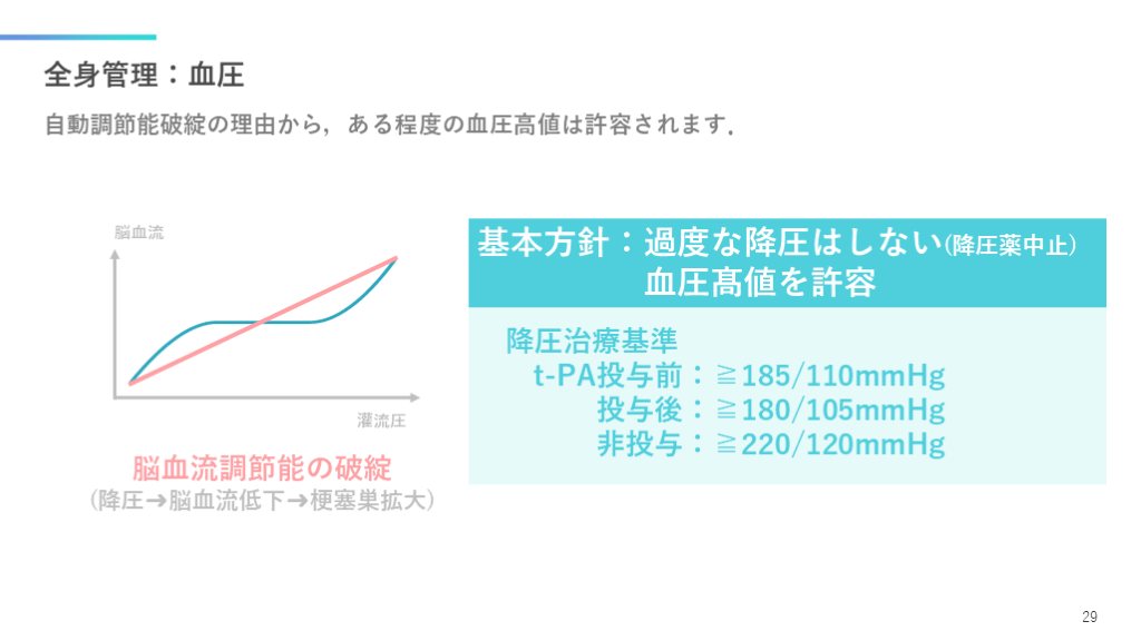 (降圧➜脳血流低下➜梗塞巣拡大) 基本方針:過度な降圧はしない(降圧薬中止)