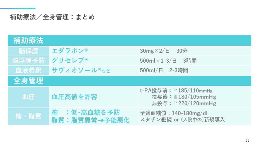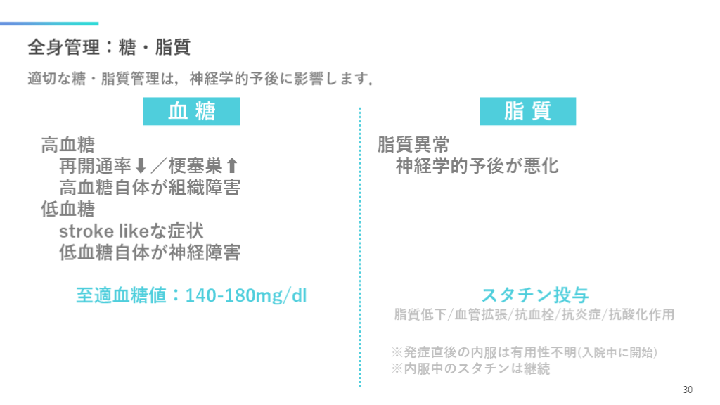 #31. 全身管理:糖・脂質 適切な糖・脂質管理は,神経学的予後に影響します. 30 脂質異常
