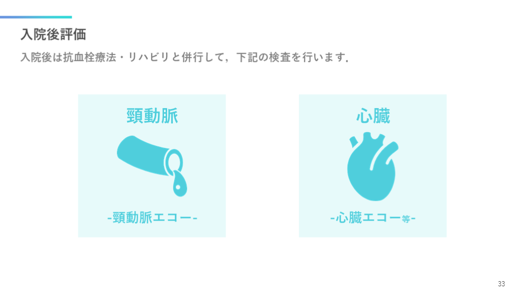 #34. 入院後評価 入院後は抗血栓療法・リハビリと併行して,下記の検査を行います. 33 頸動脈