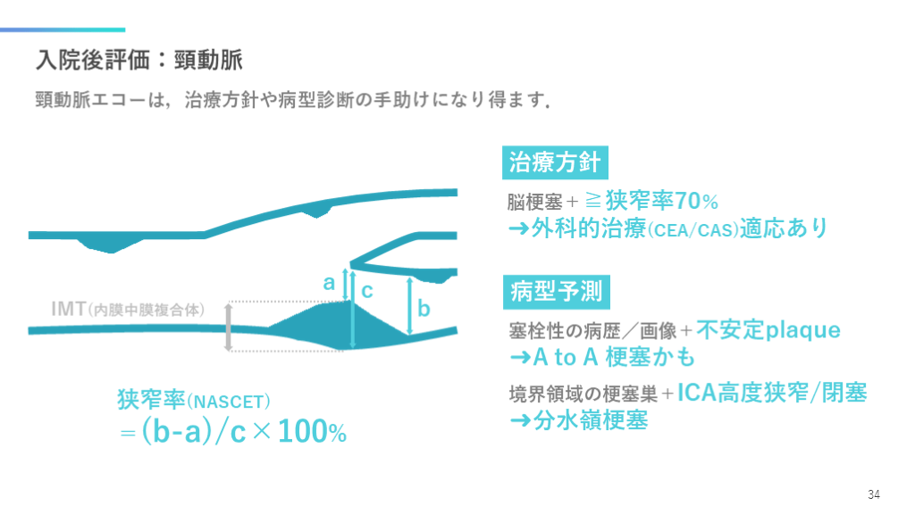 #35. 入院後評価:頸動脈 頸動脈エコーは,治療方針や病型診断の手助けになり得ます. 34 塞栓性の病歴/画像+不安定plaque
