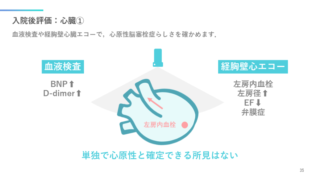 #36. 入院後評価:心臓① 血液検査や経胸壁心臓エコーで,心原性脳塞栓症らしさを確かめます. 35 左房内血栓 血液検査 経胸壁心エコー BNP⬆