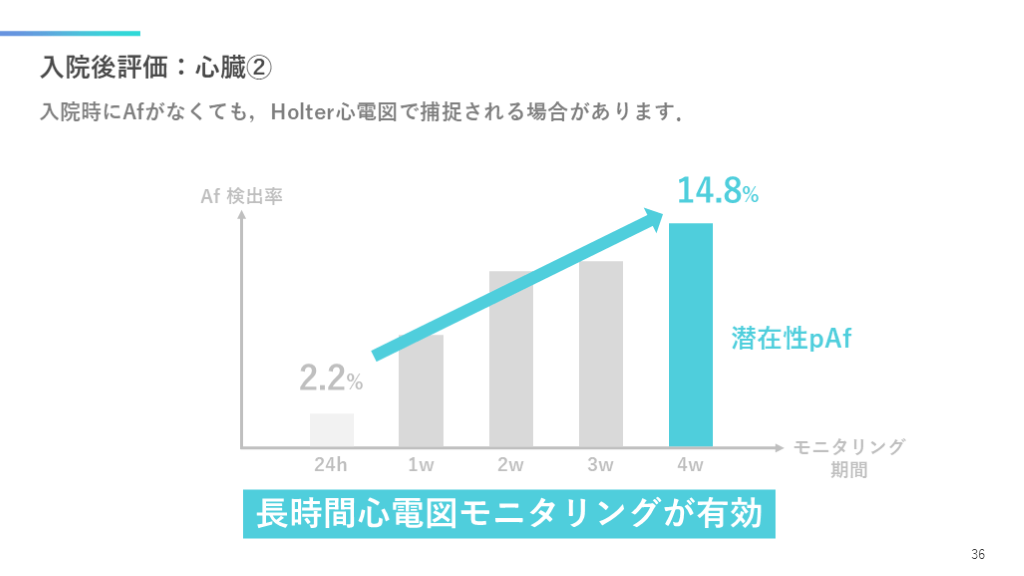 #37. 入院後評価:心臓② 入院時にAfがなくても,Holter心電図で捕捉される場合があります. 36 Af 検出率 長時間心電図モニタリングが有効 潜在性pAf