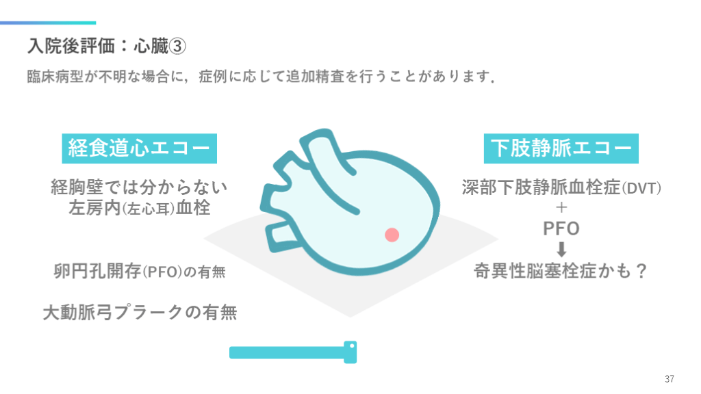#38. 入院後評価:心臓③ 臨床病型が不明な場合に,症例に応じて追加精査を行うことがあります. 37 経食道心エコー 下肢静脈エコー 経胸壁では分からない