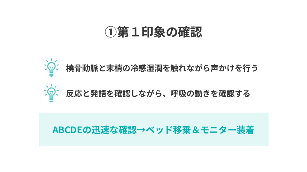 #2. ①第1印象の確認 橈骨動脈と末梢の冷感湿潤を触れながら声かけを行う 反応と発語を確認しながら、呼吸の動きを確認する ABCDEの迅速な確認→ベッド移乗&モニター装着