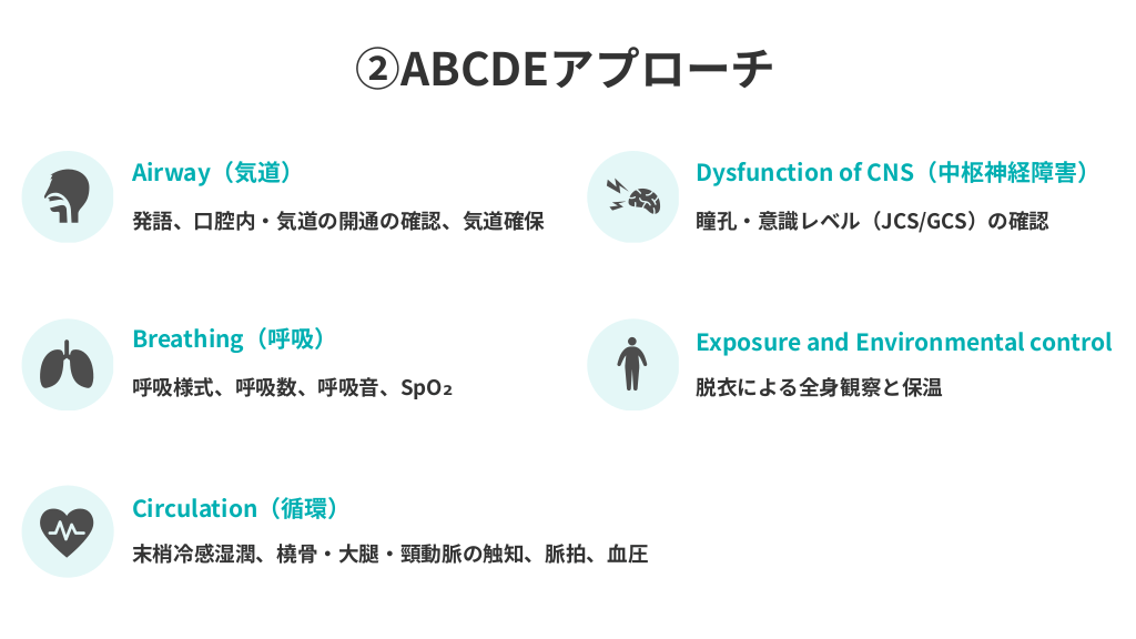 #3. ②ABCDEアプローチ Airway(気道) Dysfunction of CNS(中枢神経障害) Breathing(呼吸) Exposure and Environmental control 発語、口腔内・気道の開通の確認、気道確保 呼吸様式、呼吸数、呼吸音、SpO₂ Circulation(循環) 末梢冷感湿潤、橈骨・大腿・頸動脈の触知、脈拍、血圧 瞳孔・意識レベル(JCS/GCS)の確認 脱衣による全身観察と保温