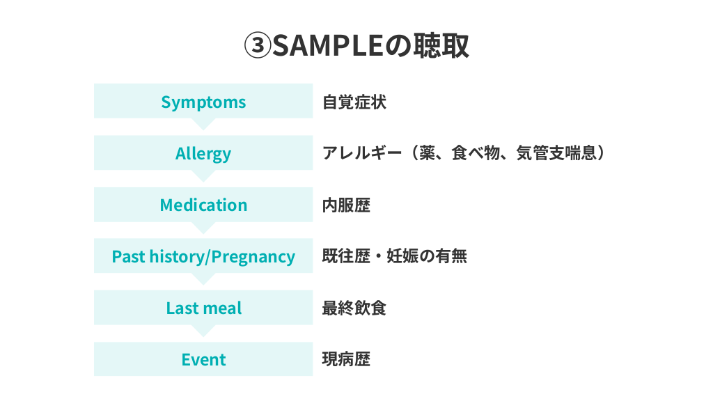 #4. ③SAMPLEの聴取 Symptoms Allergy Medication 自覚症状 アレルギー(薬、食べ物、気管支喘息) 内服歴 Past history/Pregnancy 既往歴・妊娠の有無 Last meal 最終飲食 Event 現病歴