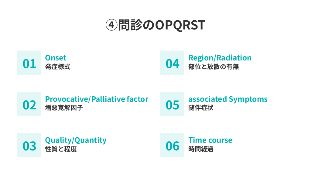 #5. ④問診のOPQRST 01 Onset 発症様式 04 Region/Radiation 02 Provocative/Palliative factor 増悪寛解因子 05 associated Symptoms 03 Quality/Quantity 06 Time course 性質と程度 部位と放散の有無 随伴症状 時間経過