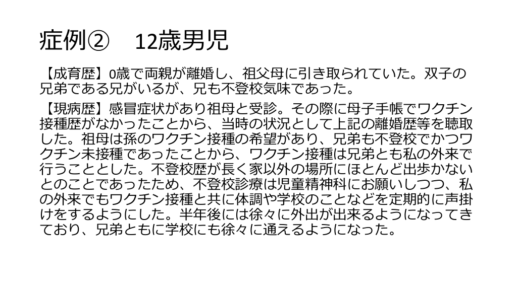 #10. 症例② 12歳男児 【成育歴】0歳で両親が離婚し、祖父母に引き取られていた。双子の 兄弟である兄がいるが、兄も不登校気味であった。 【現病歴】感冒症状があり祖母と受診。その際に母子手帳でワクチン 接種歴がなかったことから、当時の状況として上記の離婚歴等を聴取 した。祖母は孫のワクチン接種の希望があり、兄弟も不登校でかつワ クチン未接種であったことから、ワクチン接種は兄弟とも私の外来で 行うこととした。不登校歴が長く家以外の場所にほとんど出歩かない とのことであったため、不登校診療は児童精神科にお願いしつつ、私 の外来でもワクチン接種と共に体調や学校のことなどを定期的に声掛 けをするようにした。半年後には徐々に外出が出来るようになってき ており、兄弟ともに学校にも徐々に通えるようになった。