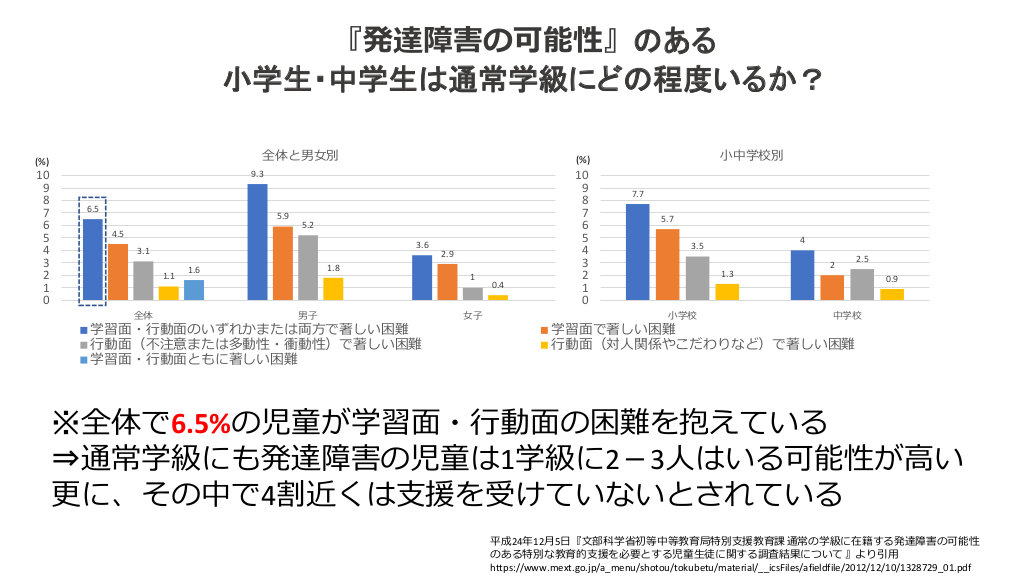 #11. 『発達障害の可能性』のある 小学生・中学生は通常学級にどの程度いるか? 全体と男女別 (%) 10 9 8 7 6 5 4 3 2 1 0 9.3 6.5 6.5 4.5 3.1 3.6 3.1 1.1 全体 5.9 5.2 1.6 全体 1.1 1.6 男子 5.2 2.9 1.8 学習面・行動面のいずれかまたは両方で著しい困難 行動面(不注意または多動性・衝動性)で著しい困難 学習面・行動面ともに著しい困難 1.8 1 0.4 女子男子 小中学校別 (%) 9.3 5.9 4.5 全体と男女別 10 9 8 7 6 5 4 3 2 1 0 7.7 5.7 3.63.5 4 2.9 1.3 小学校 2 1 女子 2.5 0.9 0.4 中学校 学習面で著しい困難 行動面(対人関係やこだわりなど)で著しい困難 ※全体で6.5%の児童が学習面・行動面の困難を抱えている ⇒通常学級にも発達障害の児童は1学級に2-3人はいる可能性が高い 更に、その中で4割近くは支援を受けていないとされている 平成24年12月5日『文部科学省初等中等教育局特別支援教育課 通常の学級に在籍する発達障害の可能性 のある特別な教育的支援を必要とする児童生徒に関する調査結果について 』より引用 https://www.mext.go.jp/a_menu/shotou/tokubetu/material/__icsFiles/afieldfile/2012/12/10/1328729_01.pdf