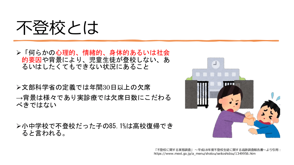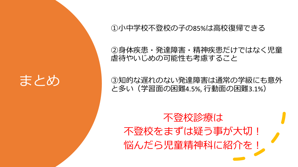 #12. ①小中学校不登校の子の85%は高校復帰できる ②身体疾患・発達障害・精神疾患だけではなく児童 虐待やいじめの可能性も考慮すること まとめ ③知的な遅れのない発達障害は通常の学級にも意外 と多い(学習面の困難4.5%, 行動面の困難3.1%) 不登校診療は 不登校をまずは疑う事が大切! 悩んだら児童精神科に紹介を!