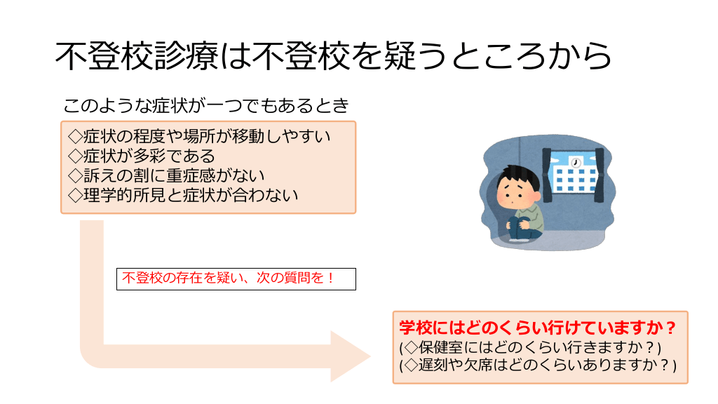 #5. 不登校診療は不登校を疑うところから このような症状が一つでもあるとき ◇症状の程度や場所が移動しやすい ◇症状が多彩である ◇訴えの割に重症感がない ◇理学的所見と症状が合わない 不登校の存在を疑い、次の質問を! 学校にはどのくらい行けていますか? (◇保健室にはどのくらい行きますか?) (◇遅刻や欠席はどのくらいありますか?)