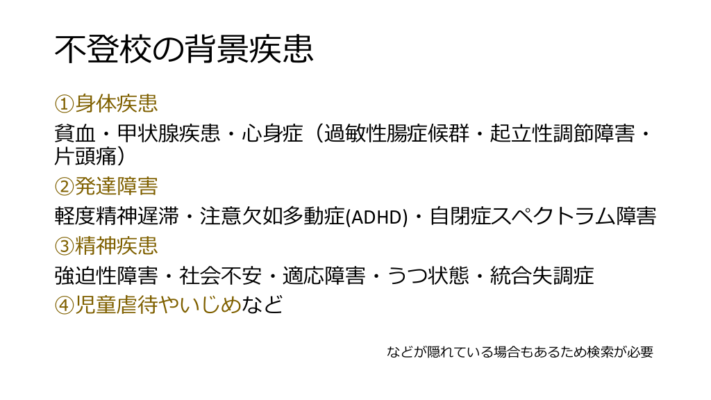 #6. 不登校の背景疾患 ①身体疾患 貧血・甲状腺疾患・心身症(過敏性腸症候群・起立性調節障害・ 片頭痛) ②発達障害 軽度精神遅滞・注意欠如多動症(ADHD)・自閉症スペクトラム障害 ③精神疾患 強迫性障害・社会不安・適応障害・うつ状態・統合失調症 ④児童虐待やいじめなど などが隠れている場合もあるため検索が必要