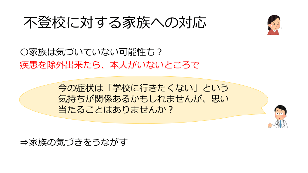 #7. 不登校に対する家族への対応 〇家族は気づいていない可能性も? 疾患を除外出来たら、本人がいないところで 今の症状は「学校に行きたくない」という 気持ちが関係あるかもしれませんが、思い 当たることはありませんか? ⇒家族の気づきをうながす