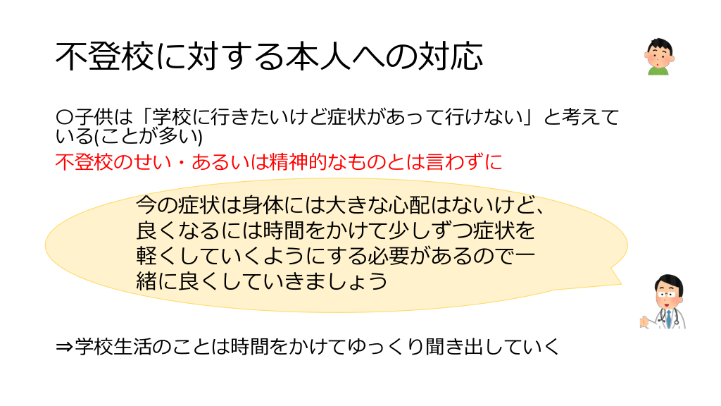 #8. 不登校に対する本人への対応 〇子供は「学校に行きたいけど症状があって行けない」と考えて いる(ことが多い) 不登校のせい・あるいは精神的なものとは言わずに 今の症状は身体には大きな心配はないけど、 良くなるには時間をかけて少しずつ症状を 軽くしていくようにする必要があるので一 緒に良くしていきましょう ⇒学校生活のことは時間をかけてゆっくり聞き出していく
