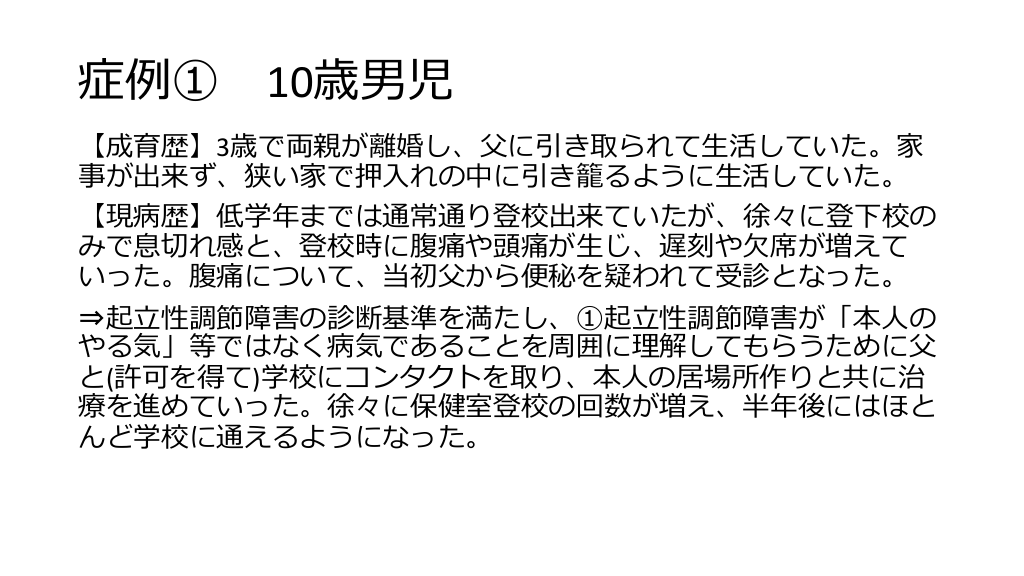 #9. 症例① 10歳男児 【成育歴】3歳で両親が離婚し、父に引き取られて生活していた。家 事が出来ず、狭い家で押入れの中に引き籠るように生活していた。 【現病歴】低学年までは通常通り登校出来ていたが、徐々に登下校の みで息切れ感と、登校時に腹痛や頭痛が生じ、遅刻や欠席が増えて いった。腹痛について、当初父から便秘を疑われて受診となった。 ⇒起立性調節障害の診断基準を満たし、①起立性調節障害が「本人の やる気」等ではなく病気であることを周囲に理解してもらうために父 と(許可を得て)学校にコンタクトを取り、本人の居場所作りと共に治 療を進めていった。徐々に保健室登校の回数が増え、半年後にはほと んど学校に通えるようになった。