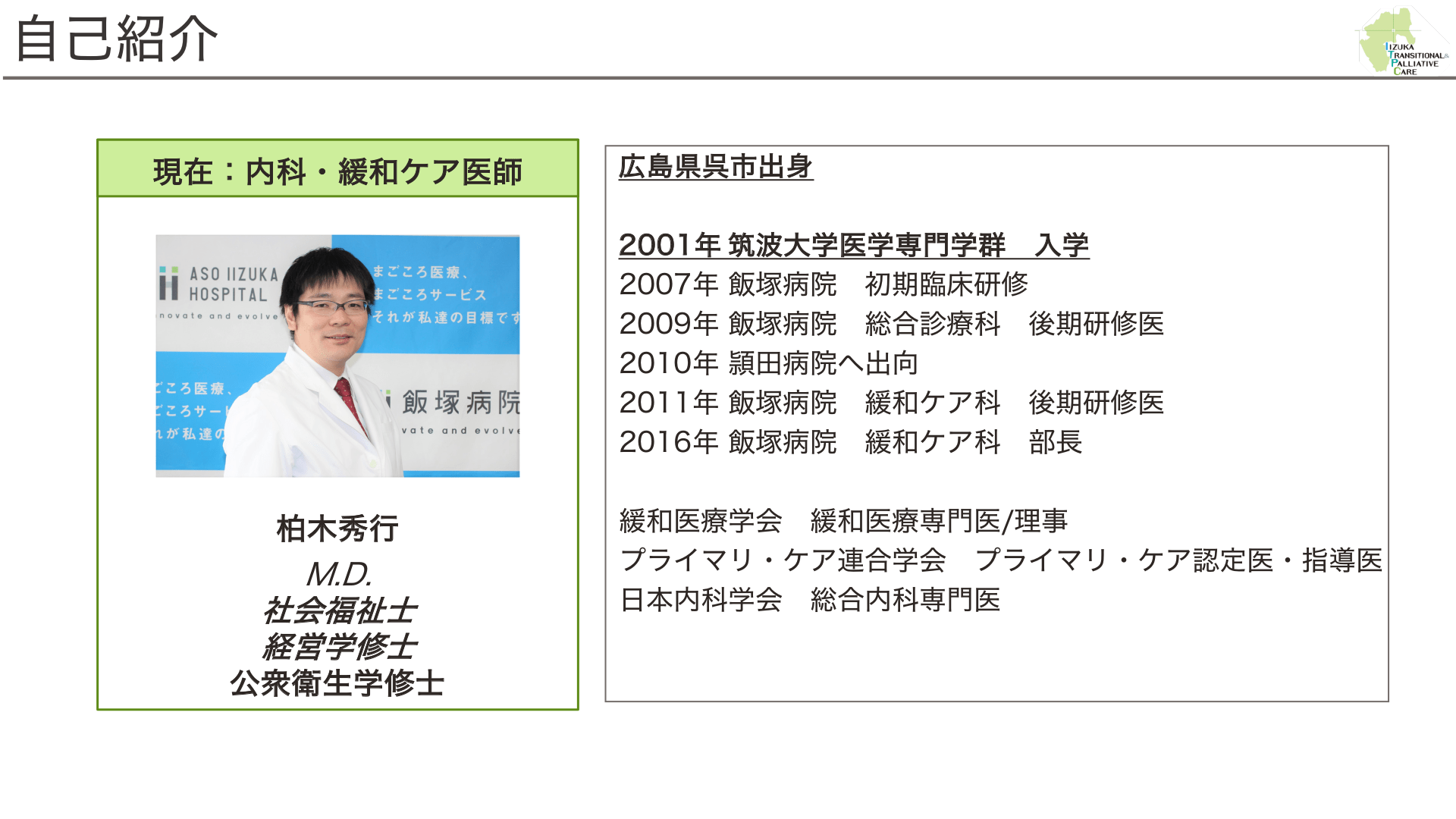 #2. 自己紹介 現在:内科・緩和ケア医師 広島県呉市出身 2001年 筑波大学医学専門学群 入学 2007年 飯塚病院 初期臨床研修 2009年 飯塚病院 総合診療科 後期研修医 2010年 頴田病院へ出向 2011年 飯塚病院 緩和ケア科 後期研修医 2016年 飯塚病院 緩和ケア科 部長 柏木秀行 M.D. 社会福祉士 経営学修士 公衆衛生学修士 緩和医療学会 緩和医療専門医/理事 プライマリ・ケア連合学会 プライマリ・ケア認定医・指導医 日本内科学会 総合内科専門医