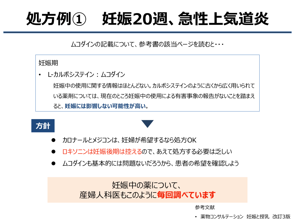 #10. 処⽅例① 妊娠20週、急性上気道炎 ムコダインの記載について、参考書の該当ページを読むと・・・ 妊娠期 • L-カルボシステイン︓ムコダイン 妊娠中の使⽤に関する情報はほとんどない。カルボシステインのように古くから広く⽤いられて いる薬剤については、現在のところ妊娠中の使⽤による有害事象の報告がないことを踏まえ ると、妊娠には影響しない可能性が⾼い。 ⽅針 l カロナールとメジコンは、妊婦が希望するなら処⽅OK l ロキソニンは妊娠後期は控えるので、あえて処⽅する必要は乏しい l ムコダインも基本的には問題ないだろうから、患者の希望を確認しよう 妊娠中の薬について、 産婦⼈科医もこのように毎回調べています 参考⽂献 • 薬物コンサルテーション 妊娠と授乳 改訂3版