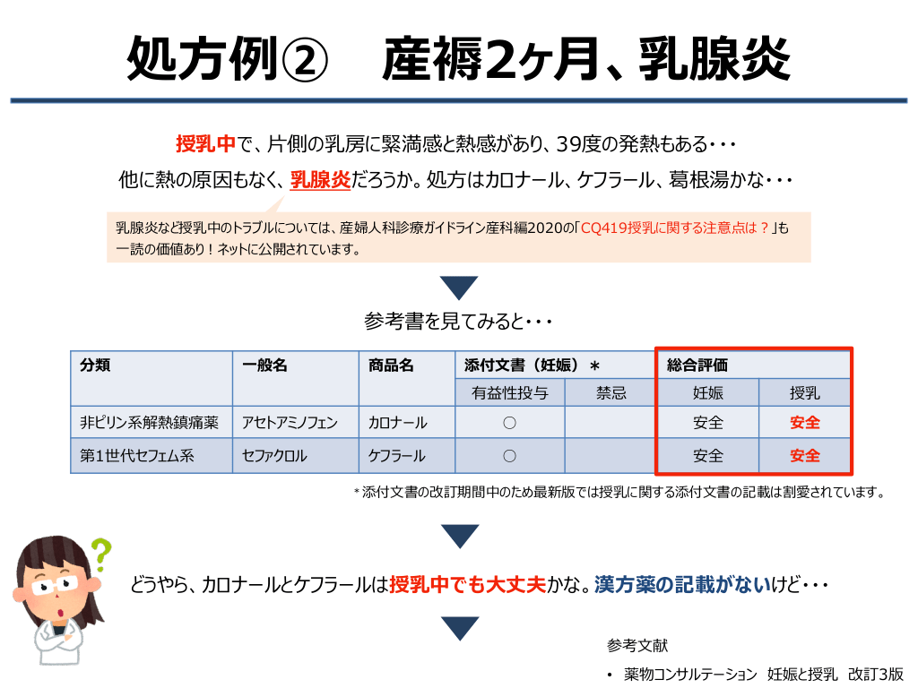 #11. 処⽅例② 産褥2ヶ⽉、乳腺炎 授乳中で、⽚側の乳房に緊満感と熱感があり、39度の発熱もある・・・ 他に熱の原因もなく、乳腺炎だろうか。処⽅はカロナール、ケフラール、葛根湯かな・・・ 乳腺炎など授乳中のトラブルについては、産婦⼈科診療ガイドライン産科編2020の「CQ419授乳に関する注意点は︖」も ⼀読の価値あり︕ネットに公開されています。 参考書を⾒てみると・・・ 分類 ⼀般名 商品名 添付⽂書(妊娠)* 有益性投与 総合評価 禁忌 妊娠 授乳 ⾮ピリン系解熱鎮痛薬 アセトアミノフェン カロナール ○ 安全 安全 第1世代セフェム系 セファクロル ケフラール ○ 安全 安全 * 添付⽂書の改訂期間中のため最新版では授乳に関する添付⽂書の記載は割愛されています。 どうやら、カロナールとケフラールは授乳中でも⼤丈夫かな。漢⽅薬の記載がないけど・・・ 参考⽂献 • 薬物コンサルテーション 妊娠と授乳 改訂3版