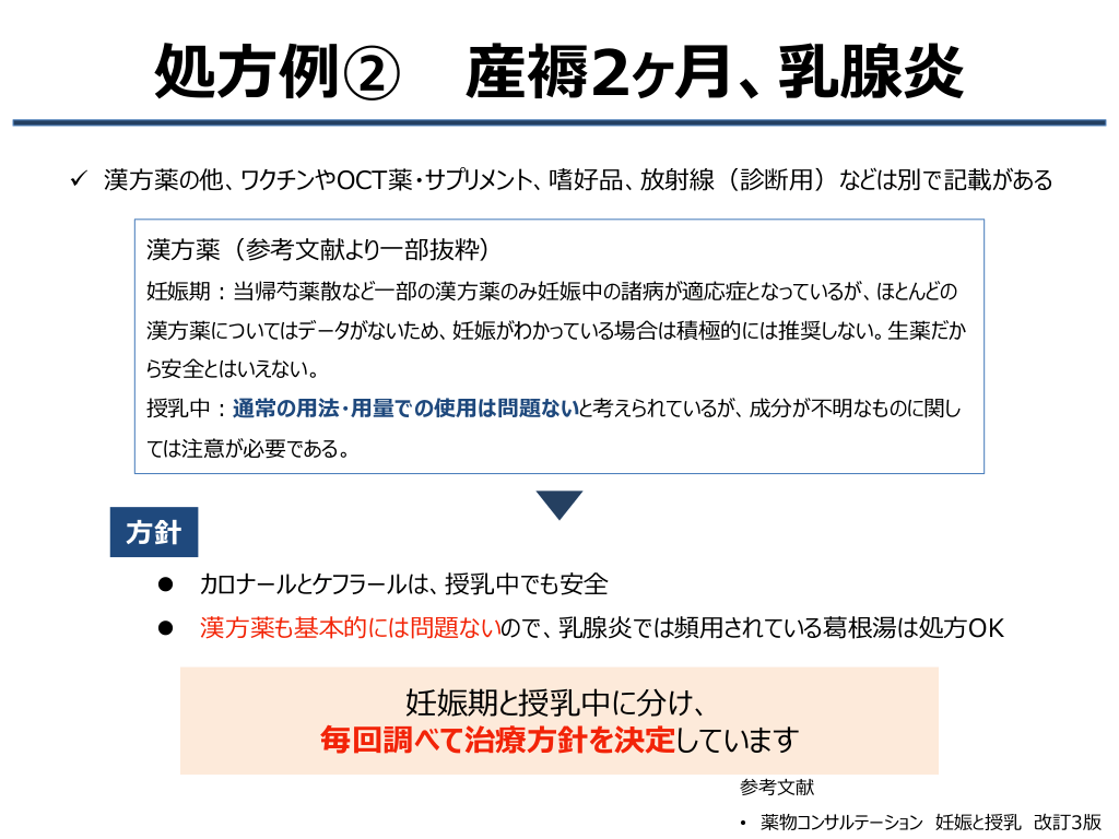 #12. 処⽅例② 産褥2ヶ⽉、乳腺炎 ü 漢⽅薬の他、ワクチンやOCT薬・サプリメント、嗜好品、放射線(診断⽤)などは別で記載がある 漢⽅薬(参考⽂献より⼀部抜粋) 妊娠期︓当帰芍薬散など⼀部の漢⽅薬のみ妊娠中の諸病が適応症となっているが、ほとんどの 漢⽅薬についてはデータがないため、妊娠がわかっている場合は積極的には推奨しない。⽣薬だか ら安全とはいえない。 授乳中︓通常の⽤法・⽤量での使⽤は問題ないと考えられているが、成分が不明なものに関し ては注意が必要である。 ⽅針 l カロナールとケフラールは、授乳中でも安全 l 漢⽅薬も基本的には問題ないので、乳腺炎では頻⽤されている葛根湯は処⽅OK 妊娠期と授乳中に分け、 毎回調べて治療⽅針を決定しています 参考⽂献 • 薬物コンサルテーション 妊娠と授乳 改訂3版