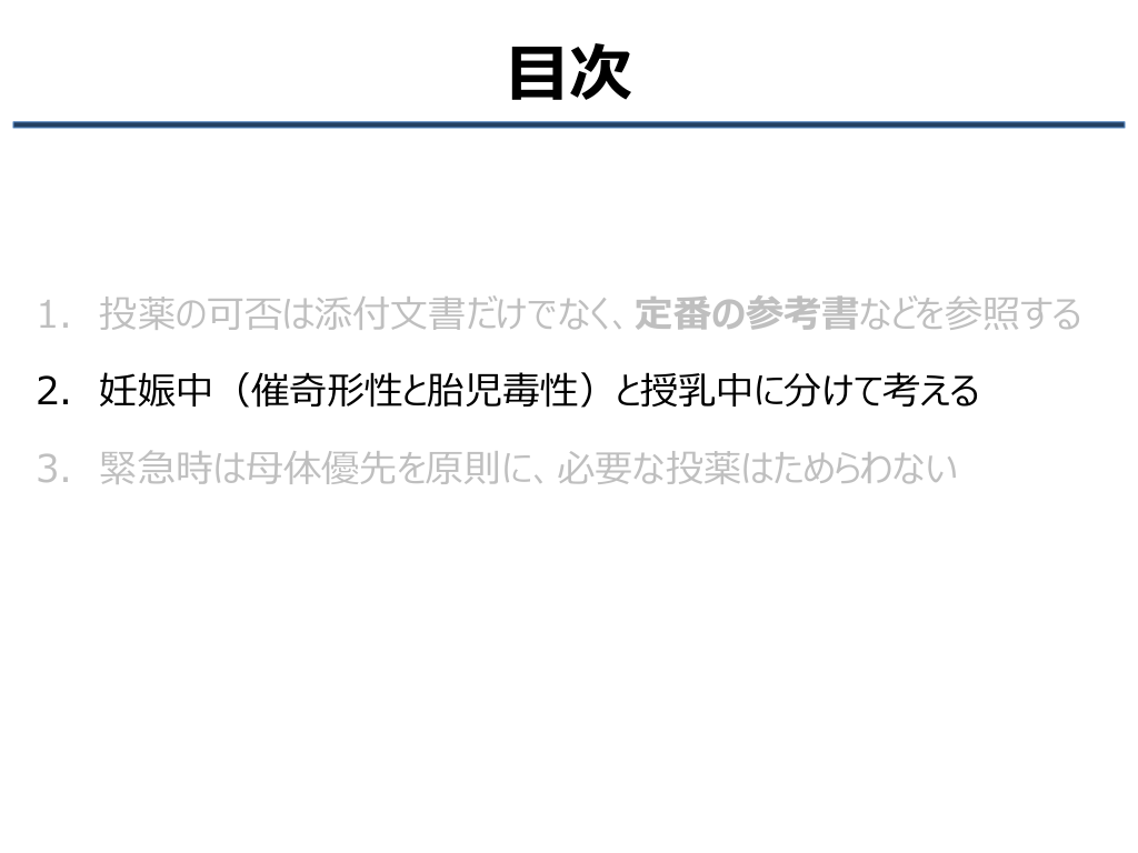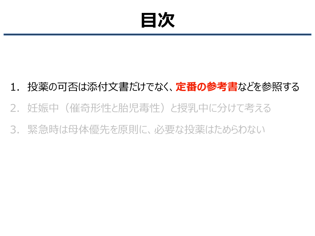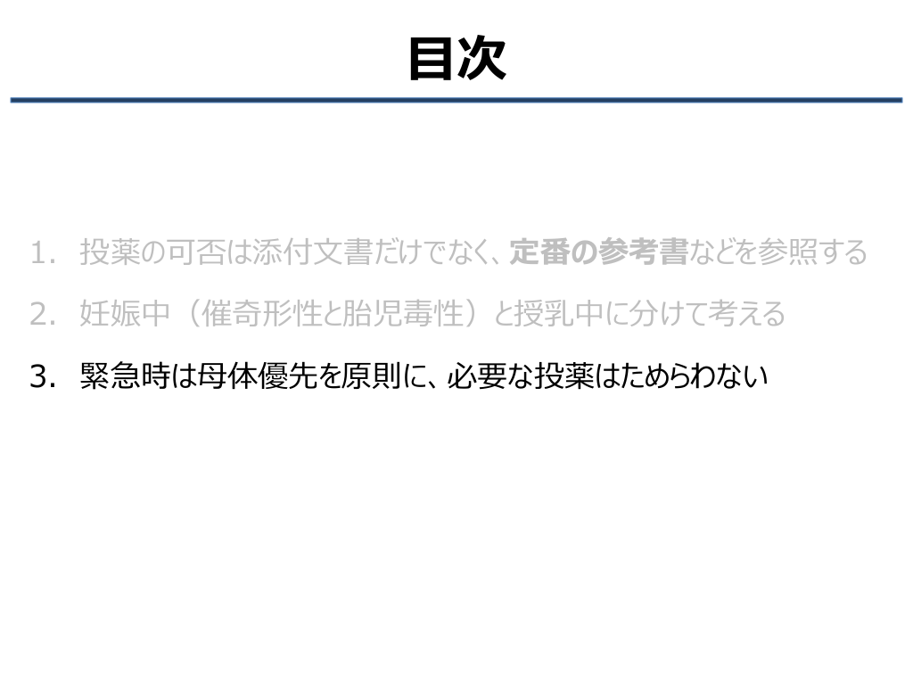 #3. ⽬次 1. 投薬の可否は添付⽂書だけでなく、定番の参考書などを参照する 2. 妊娠中(催奇形性と胎児毒性)と授乳中に分けて考える 3. 緊急時は⺟体優先を原則に、必要な投薬はためらわない