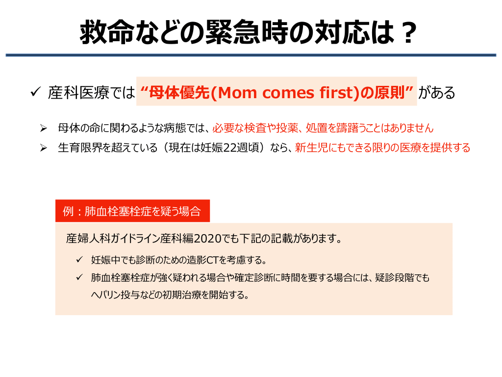 #14. 救命などの緊急時の対応は︖ ü 産科医療では “⺟体優先(Mom comes first)の原則” がある Ø ⺟体の命に関わるような病態では、必要な検査や投薬、処置を躊躇うことはありません Ø ⽣育限界を超えている(現在は妊娠22週頃)なら、新⽣児にもできる限りの医療を提供する 例︓肺⾎栓塞栓症を疑う場合 産婦⼈科ガイドライン産科編2020でも下記の記載があります。 ü 妊娠中でも診断のための造影CTを考慮する。 ü 肺⾎栓塞栓症が強く疑われる場合や確定診断に時間を要する場合には、疑診段階でも ヘパリン投与などの初期治療を開始する。