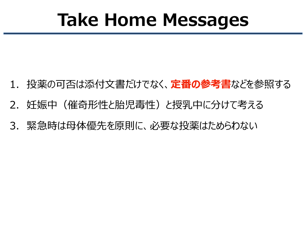 #2. Take Home Messages 1. 投薬の可否は添付⽂書だけでなく、定番の参考書などを参照する 2. 妊娠中(催奇形性と胎児毒性)と授乳中に分けて考える 3. 緊急時は⺟体優先を原則に、必要な投薬はためらわない