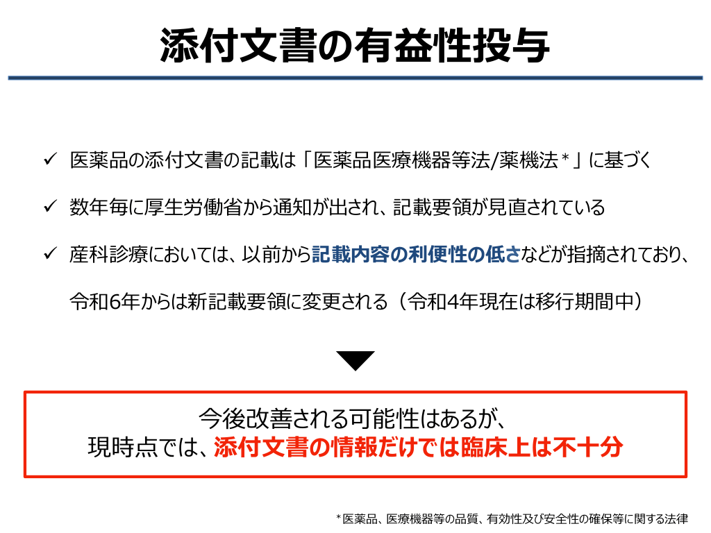 #4. 添付⽂書の有益性投与 ü 医薬品の添付⽂書の記載は 「医薬品医療機器等法/薬機法*」 に基づく ü 数年毎に厚⽣労働省から通知が出され、記載要領が⾒直されている ü 産科診療においては、以前から記載内容の利便性の低さなどが指摘されており、 令和6年からは新記載要領に変更される(令和4年現在は移⾏期間中) 今後改善される可能性はあるが、 現時点では、添付⽂書の情報だけでは臨床上は不⼗分 * 医薬品、医療機器等の品質、有効性及び安全性の確保等に関する法律