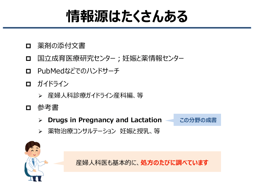#5. 情報源はたくさんある p 薬剤の添付⽂書 p 国⽴成育医療研究センター︔妊娠と薬情報センター p PubMedなどでのハンドサーチ p ガイドライン Ø 産婦⼈科診療ガイドライン産科編、等 p 参考書 Ø Drugs in Pregnancy and Lactation この分野の成書 Ø 薬物治療コンサルテーション 妊娠と授乳、等 産婦⼈科医も基本的に、処⽅のたびに調べています